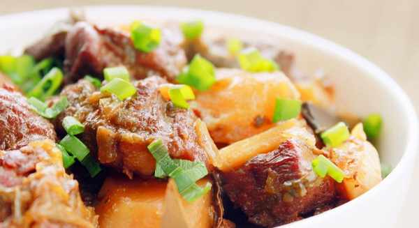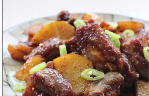 材料:酸菜、土豆、牛胸肉、老抽、生抽、糖、小蘇打、薑、蒜