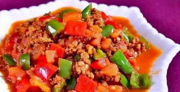 4.把肉推到鍋邊,烤一個大青椒和一個大紅椒。加入切丁的西紅柿,然後將所有東西一起炒。把肉末推下去,加入醬油、少許鹽和雞粉拌勻調味。