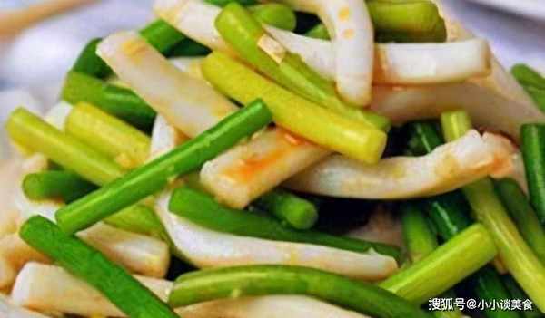 原料:蒜苗200克,魷魚1條。鹽、香油、料酒適量、味精、芥末油少許。