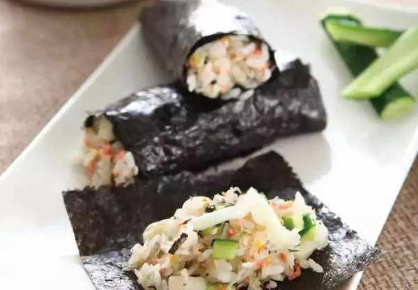 3.取一片海苔片鋪平,取適量作法2的醋飯,撒上適量素肉松,卷起食用即可。