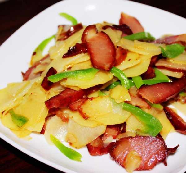 3.鍋內倒入油,放入蒜片炒香,放入臘肉翻炒半分鐘。油出後,放入土豆片翻炒至土豆片呈金黃色,再放入青椒翻炒至出鍋。培根本身很油很咸,所以口味淡的朋友可以不用放鹽