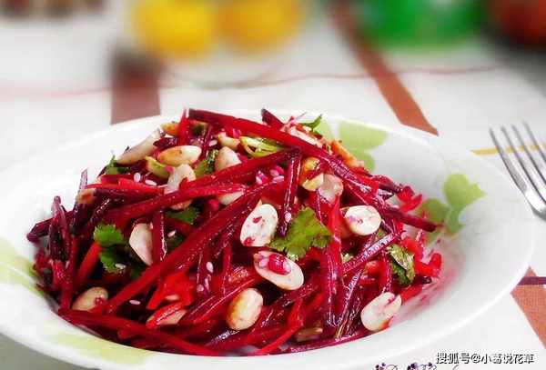 甜菜根1根、胡蘿卜半根、白芝麻、花生仁、香菜、鹽、植物油、熟醋、黑胡椒
