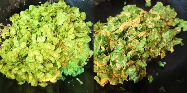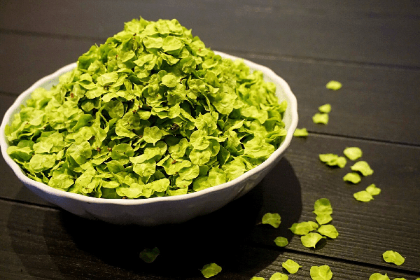 4、我們把榆錢取出來,放到盤中散開,這樣可以讓水分盡可能散掉。蒸好的榆錢飯可以直接吃,也可以蘸上蒜汁或是辣椒油來豐富味道。既是飯,也是菜,開胃爽口。
