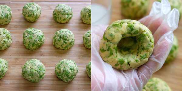 4、發好的榆錢取出,按揉細膩,搓長之後切小份,接著將每一個小的面團,都在手中整理成上尖下圓,底部中空的窩頭狀。