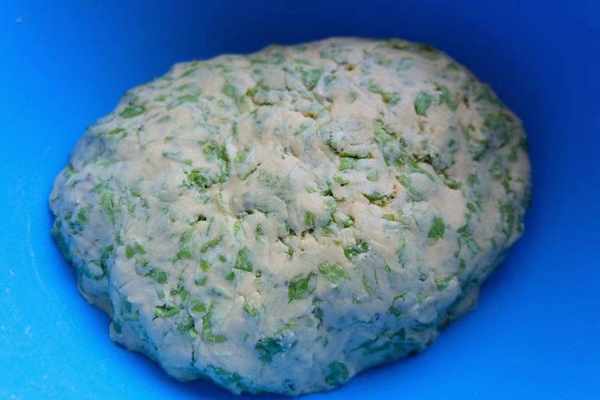 3、一盒牛奶在熱水中泡熱一些,然後用來和面,將榆錢與各種粉面揉成團狀,進行充分的發酵。