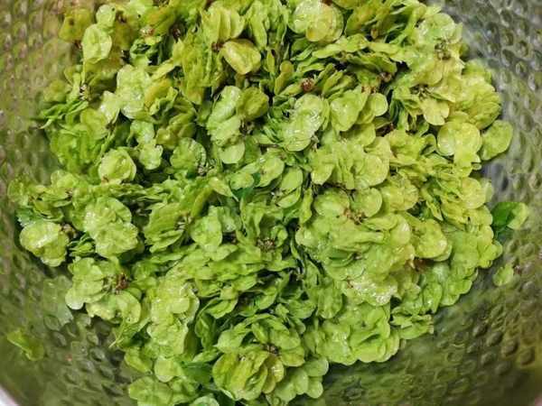 1、榆錢先篩一篩,挑出樹梗,臟東西等,然後放到大盆中,放一些小蘇打,泡十分鐘。接著我們從水中撈起來,在水龍頭下反復沖洗幹凈。接著把水分徹底瀝幹。