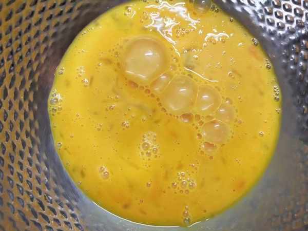 2、根據榆錢的量來準備雞蛋的量,先把蛋液攪勻,讓蛋黃與蛋白融合到一起,調入少許鹽攪勻。
