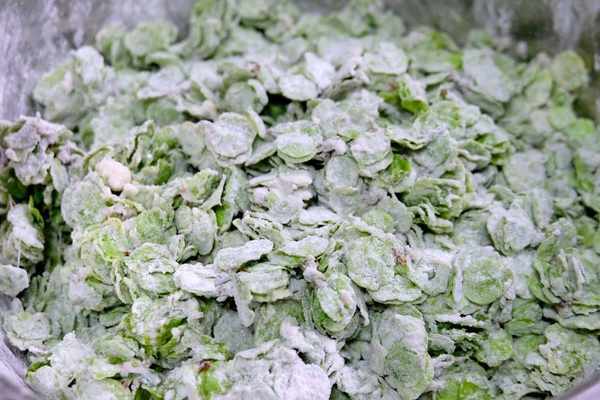 2、接著準備適量的面粉,然後撒一些,就晃動幾下,全部沾到榆錢上,再撒,再晃動,直到榆錢的表面都沾滿面粉。