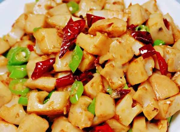 2、起鍋燒油,放入蔥、蒜末和幹辣椒炒香放入藕丁,翻炒2分鐘。