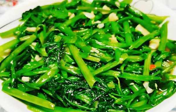 3、起鍋燒油,油熱放入蒜末爆香,再放入空心菜炒一分鐘,再倒入醬汁翻炒片刻即可。