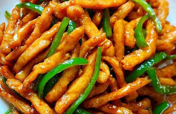 1、雞身材肉洗凈切絲,青椒洗凈切絲,蒜切末。