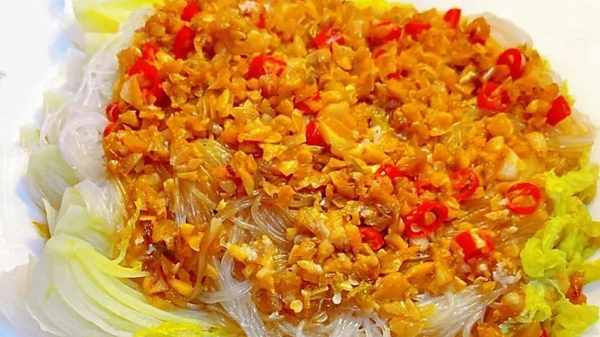 3、另起鍋把娃娃菜放鍋底,再鋪上粉絲,淋上醬汁,上鍋蒸熟後撒蔥花即可。