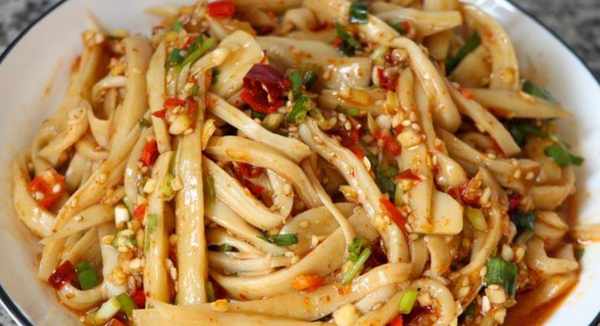 3.蓮藕瀝幹水分之後放入盤中,加入白醋、鹽、麻油、白糖和小米辣,抓拌均勻即可。