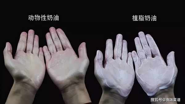 就像搓護手霜一樣,動物性奶油在揉搓的過程中,會隨著時間潤滑消失,變成透明狀,而植物學奶油,則會越揉越膩,粘在手上很明顯。