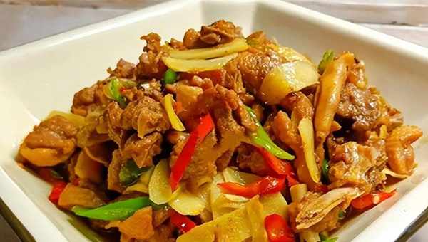 收至湯汁至7成幹後,放入仔薑,大火翻炒出香味,最後放入小米辣翻炒斷生即可盛出。