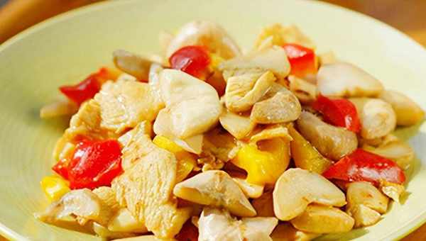鍋中熱油,放入雞身材肉滑炒變色後,接著放入菱角和彩椒丁,大火翻炒幾下,加入食鹽和雞精調味,繼續翻炒至斷生出鍋即可。