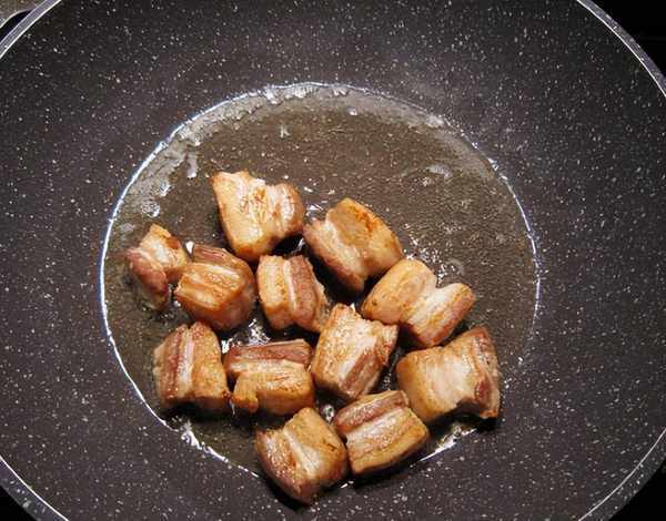 1、準備半斤五花肉,將其洗凈切片的五花肉用生抽醃制二十分鐘。起鍋燒油,下入醃制好的五花肉,煸炒至六時尚,盛出備用。