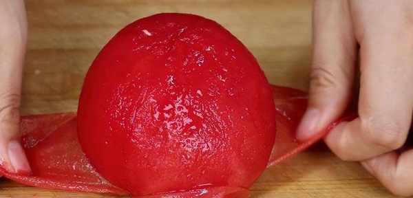 2、給西紅柿劃個十字花刀,將西紅柿放入沸水中燙兩分鐘,直到能輕松地把皮剝下來。將去皮的西紅柿切成滾刀塊,裝入盤中備用。