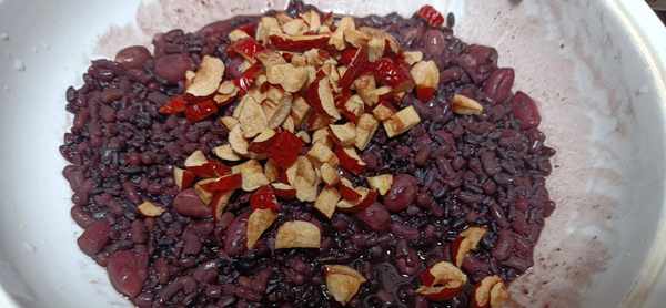 2.花生剝去殼,清洗幹凈;黑米準備2把,清洗幹凈;紅棗10顆,去核,用剪刀,剪成小粒。