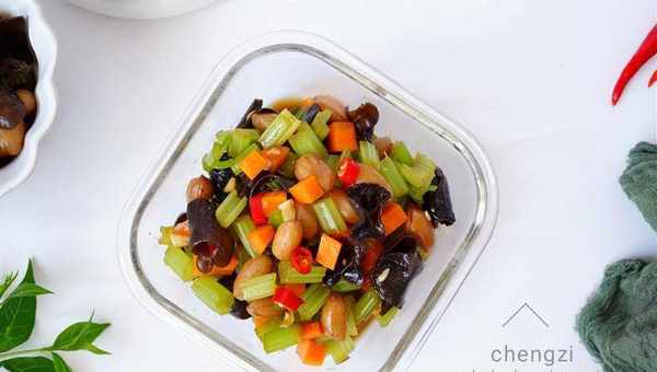 6、把晾涼的花生米、芹菜、木耳、胡蘿卜都放入盆中,加入一些蒜末、小米椒。