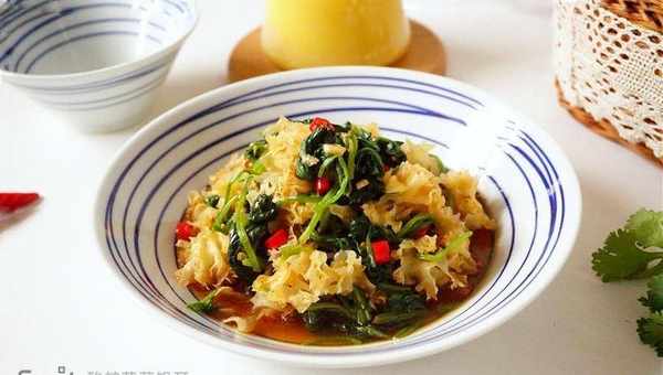 6、最後把銀耳、菠菜都放入盆中,倒入調料汁拌勻即可。