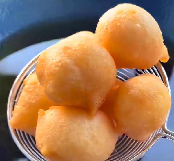 鍋中燒油,等油溫有七成熱的時候,將裱花袋中的面糊擠一點放進去,炸到浮起後用筷子不停地推動,炸到顏色金黃後撈出控油。