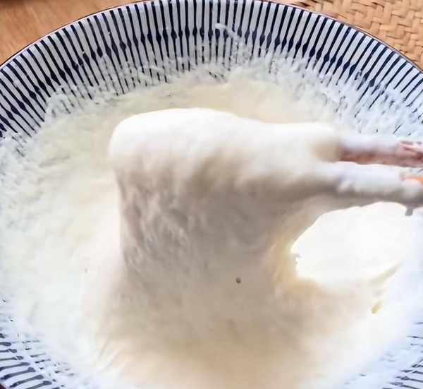 首先我們要往碗中放入150克面粉,1克酵母,1克泡打粉,140克溫牛奶,攪拌成細膩無顆粒的面糊狀,再給它覆蓋一層的保鮮膜,或者是蓋上蓋子,醒發到油原先的1.5倍大。