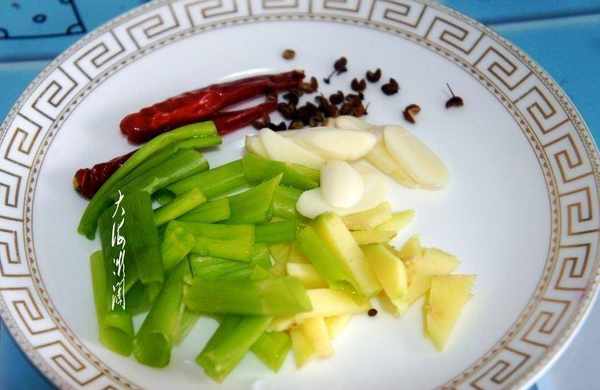 蔥、薑、蒜分別去皮洗凈,然後分別切段切片,準備一點花椒粒,2個小米辣。