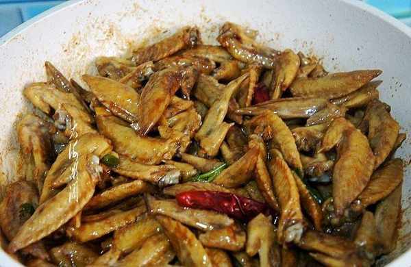 炒鍋加入適量的油,下入準備好的各種調味料,爆出香味,然後下入雞翅尖翻炒均勻。