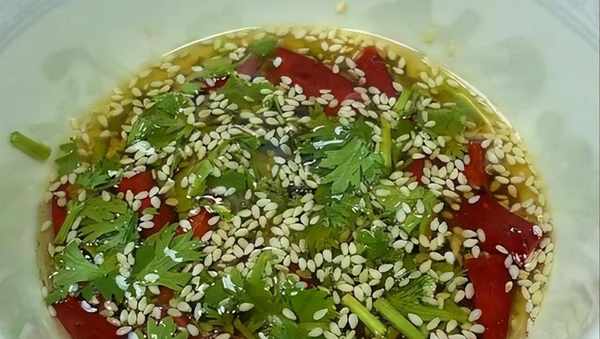再來點鮮蒜頭搗成蒜末,這樣會更加出氣質,半勺幹辣椒,少許的白芝麻,適量的白糖提鮮,然後用熱油激發出調理的香味,繼續放入半勺生抽,一勺的米醋,少許的食用鹽、雞精粉、白糖調味。再放入少許的香油和香菜,然後用筷子攪拌均勻。咱們的料汁就算是調好瞭。