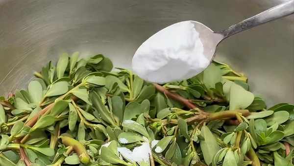 我們老傢馬齒筧這叫麻衫菜,采回來的馬齒筧,我們一定要整理一下,首先我們要摘掉鮮美的部分,然後加入一勺精鹽,少許的小蘇打,咱們給它浸泡十分鐘。