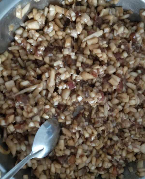 我個人建議:在切茄子的時候,最好不要把茄子皮去掉,因為這樣會造成維生素B的減少,如果感覺影響口感的話,也可以去掉皮,這個根據個人口味吧。然後把醃制好的肉丁倒入切好的茄子中,再倒入適量的食用油,雞精,食鹽調一下味,倒入適量的蠔油提鮮,適量的老抽調一下色,這樣茄子餡就調好瞭,
