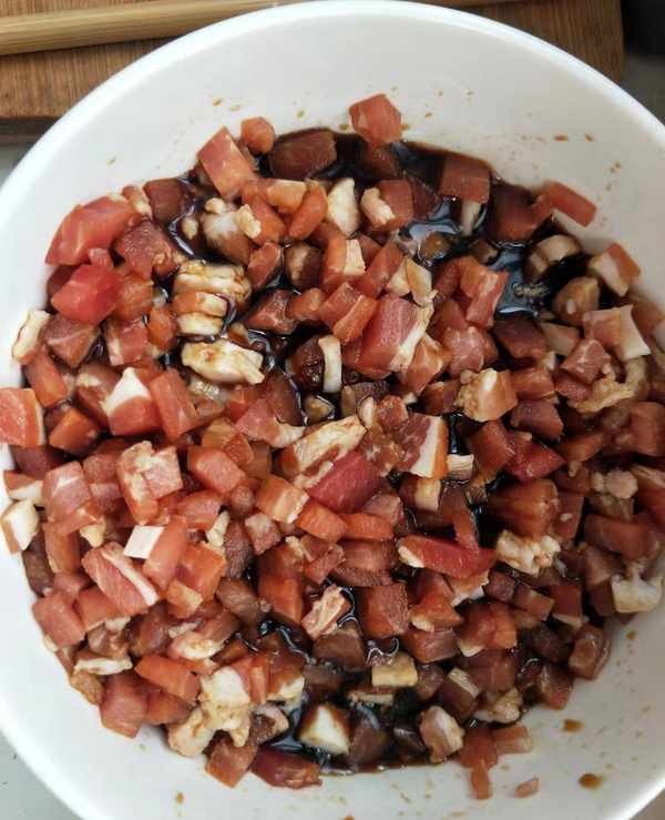 然後放在一邊醒發備用,在醒發的時候,最好用個濕籠佈或者保鮮膜蓋一下,防止面風幹。經過醒發的面更好用一些。我們把五花肉切成小丁,