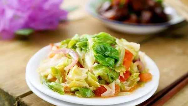 3.將包菜選大火快速翻炒後,加入少量的食鹽、生抽、味精,待香味炒出後加入少許陳醋即可,其口感鮮香清脆。