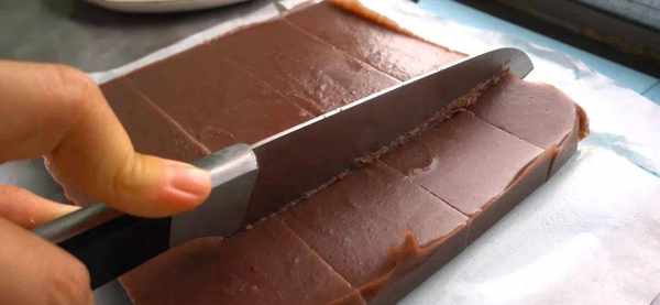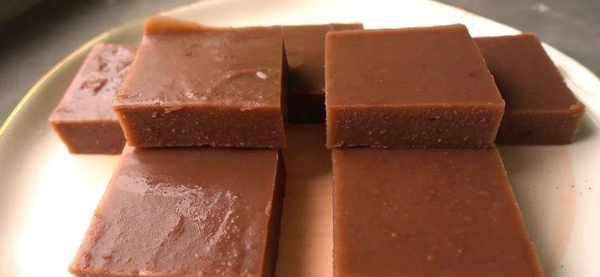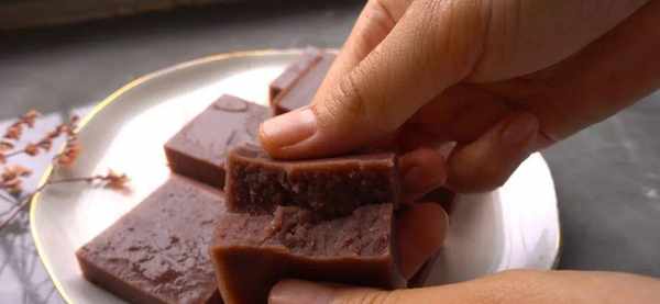 等待紅豆沙凝固成紅豆糕,這樣又滑又沙的紅豆糕就做好瞭。脫模的時候小心一點,切成小塊方便食用。