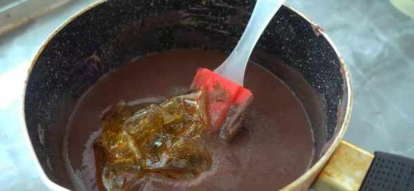 中火煮開,再加入泡軟的吉利丁攪拌均勻,吉利丁完全融化之後。