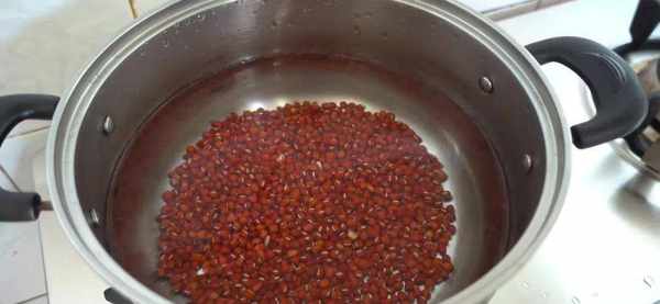先把紅豆浸泡2小時,濾掉水份之後再放入清水中,開中火煮得爛爛的。