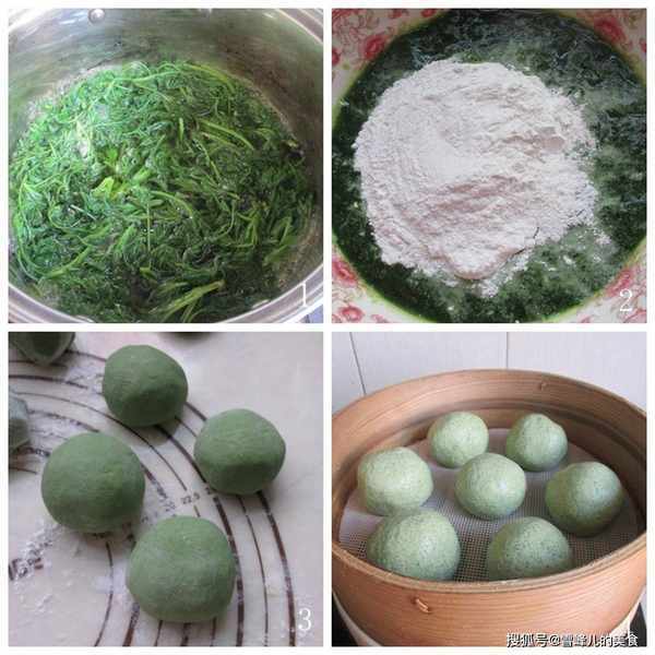 1,鍋裡稍微放上一點水,加上艾葉和食用堿面煮2分鐘,樣可以去掉艾蒿的苦澀味道,讓顏色更綠。