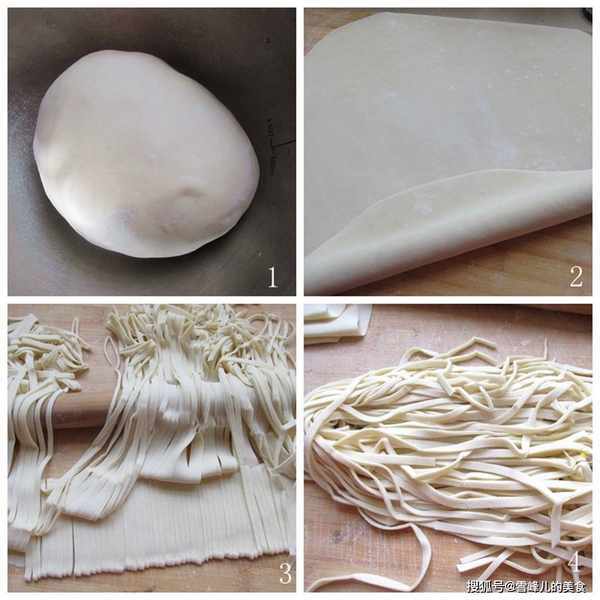 1,首先盆中放入適量的面粉、雞蛋、鹽、溫水和成軟一些的面團,靜置一個小時,搟成面片,切成條狀。