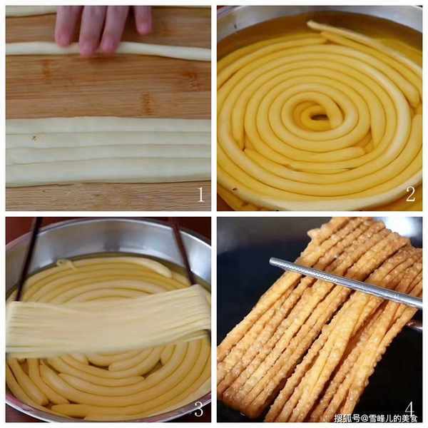 3,用手纏起來抻一下,用筷子撐住,這樣就可以準備炸制瞭。