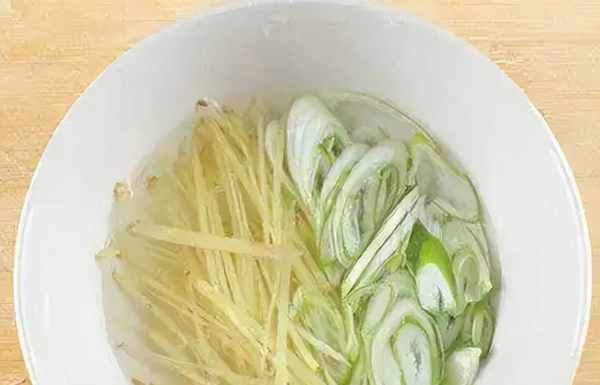 2、大蔥去皮,切成蔥段;生薑清洗幹凈,切成薑絲。放入一個幹凈的小碗中,碗中倒入,適量料酒。將蔥薑裡面的水分擠出來。