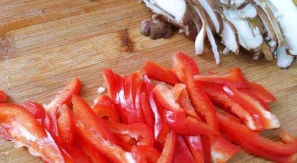 4、香菇清洗幹凈,去蒂,切成香菇片;彩椒清洗幹凈,切成絲狀;木耳提前兩小時泡發,撕成小朵。
