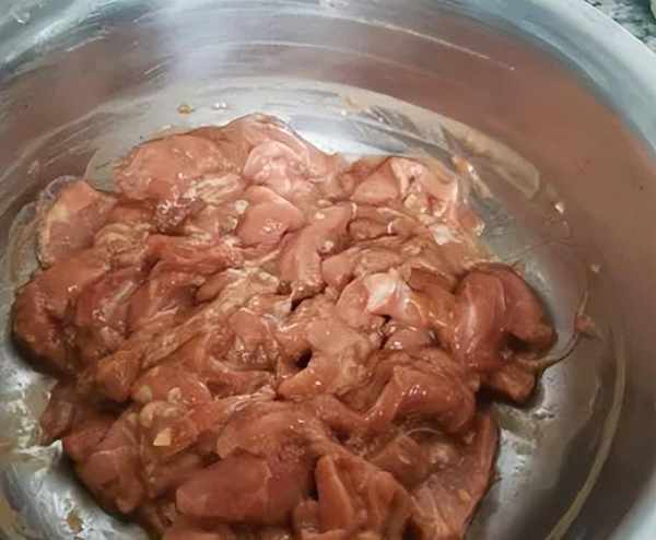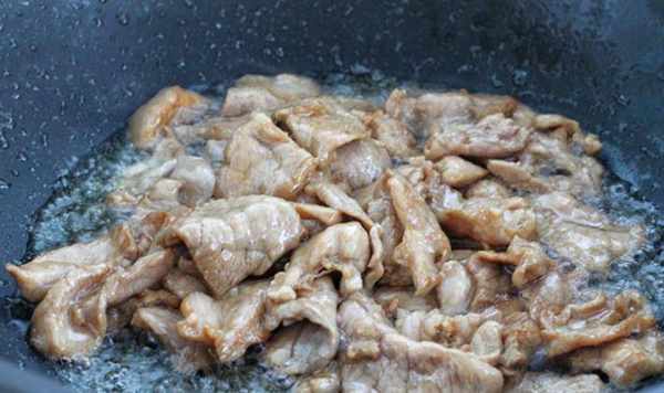 7、鍋中燒油,油五成熱左右倒入我們醃制好的肉片,下鍋滑熟,滑至肉片變色即可撈出控油。