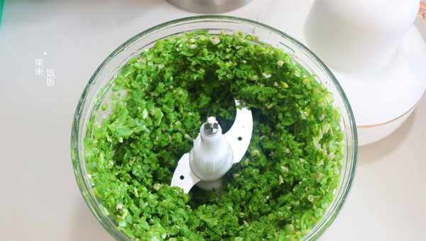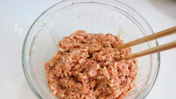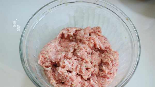 5,一斤左右肥瘦錯換的豬肉洗凈,切成小塊,放入料理機中,加入薑末和大蔥碎,再加入100克冰水或者涼水,一起絞成細膩黏稠的肉糜。