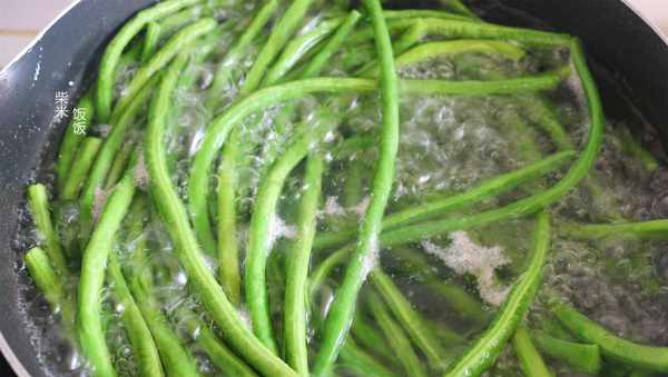2,豇豆去掉頭尾,洗凈後放入開水鍋中,再加一勺鹽進來,減少豇豆的變色。中火煮3分鐘左右,煮至七八分熟撈出。