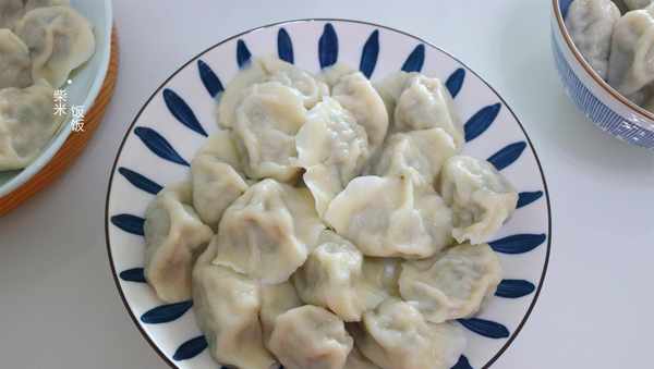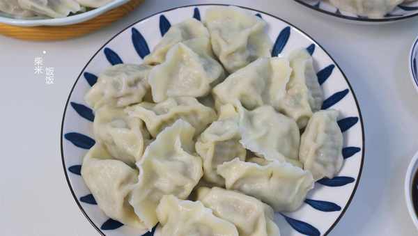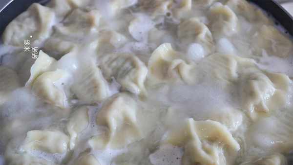 10,鍋中加入足量的清水,大火煮開後放入餃子,用勺子沿著鍋底推動,防止餃子粘鍋。再次煮沸後淋入半碗涼水,反復2~3次,待所有的餃子全部浮起來,餃子變胖,餃子皮變得時尚就可以關火撈出來瞭。