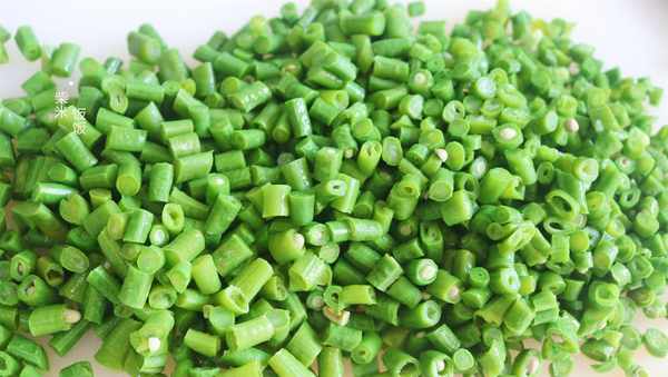 3,將煮過的豇豆用涼水淘涼,瀝幹水分後切成小段。再放入料理機中,將其絞得稍微碎一些。
