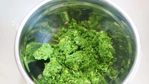 7,接著把處理好的豇豆碎也倒進來,再加入少許鹽、食用油、雞精調味,再次拌勻餡料就調好瞭。