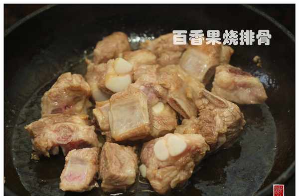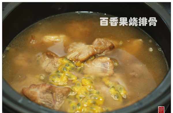 3. 將排骨取出放入砂鍋中,加入百香果的果肉與湯汁,加入開水,大火煮開後轉小火煮30分鐘左右即熄火,若湯汁太多,可以轉大火收幹湯汁再熄火。