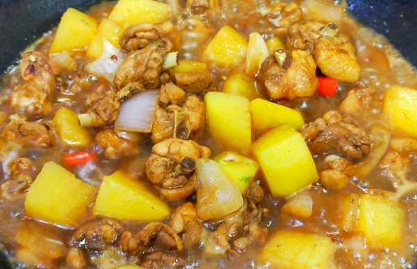 ④油熱炒制:鍋中油熱,加蒜段,小米辣段、一小塊火鍋底料,炒出香味,倒入醃制好的雞塊,翻炒至變色,關小火,繼續翻炒,加鹽、糖,倒入土豆塊,繼續翻炒,加大骨湯(從前做大盤雞拌面都是直接加清水燉,今天加大骨頭熬好的高湯,氣質更鮮)沒過食材,中小火燉煮至湯汁收至食材露出,加洋蔥,繼續燉煮至收汁,倒入準備好的拉條子面條翻炒均勻,裝盤,撒上香菜段做點綴。